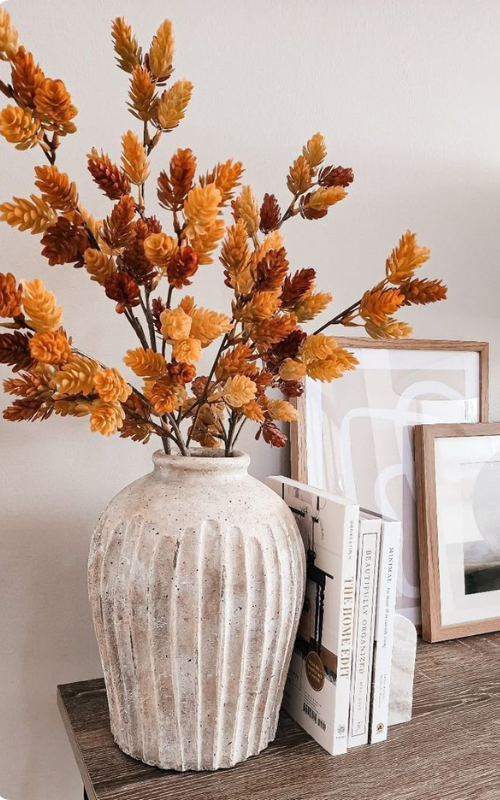 Skip the summer blooms and opt for dried florals, wheat bundles, faux eucalyptus, or branches with golden leaves. Use rustic vases, mason jars, or vintage pitchers to add a relaxed, homey feel to your mantel, console table, or dining centerpiece.