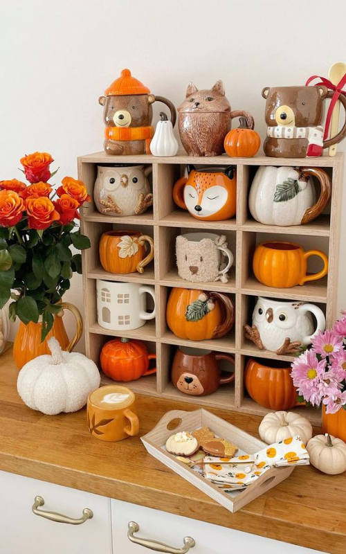 Set up a designated corner with mugs, tea bags, hot chocolate, cinnamon sticks, and marshmallows. Use a wooden tray or tiered stand for visual interest, and let it double as a charming decor moment.