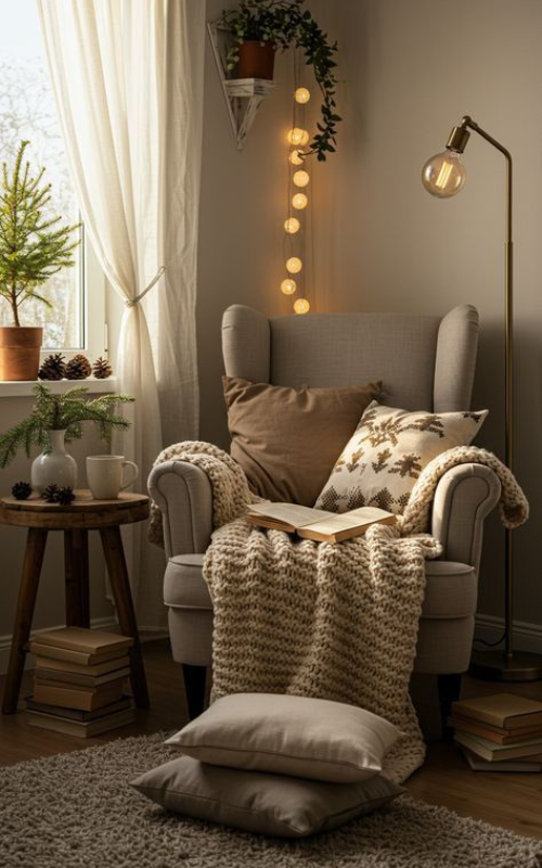 Transform a corner of your home into a quiet retreat. Add a comfy chair, soft blanket, floor lamp, and a stack of your favorite seasonal reads. Bonus: Include a small tray for hot tea, cocoa, or spiced cider.