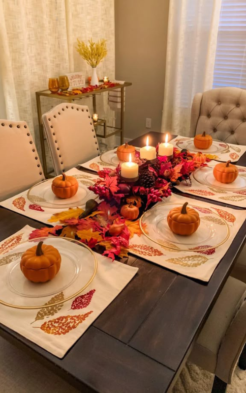 Switch to a linen or plaid table runner, add brass or ceramic candleholders, and layer in mini pumpkins or eucalyptus sprigs. Don’t forget those warm-toned napkins and seasonal plates for a festive, functional setup.