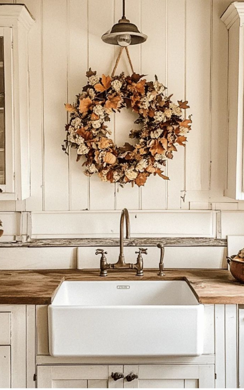 Wreaths aren’t just for front doors. Hang a fall wreath made of dried leaves, twigs, or berries above your fireplace, in your kitchen, or even in a hallway to bring autumn charm throughout the home.