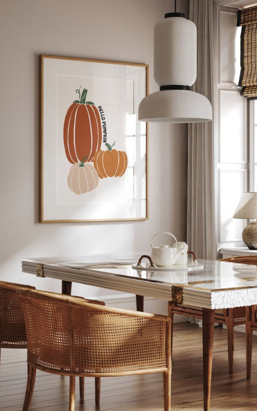 Switch out existing artwork for autumn-themed prints or canvases. Vintage botanical illustrations, woodland landscapes, or hand-lettered seasonal quotes can shift the mood instantly and tie the whole room together.