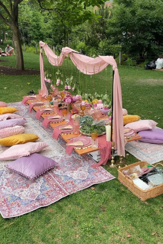 A full-on decor dream. Think pink draped canopies, layered rugs, velvet cushions, and gold-rimmed glasses—all wrapped in a floral fantasy. This setup is perfect for making memories that look just as good as they feel.