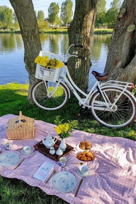 12. Riverside Picnic with Bike, Gingham Blanket, and Tea Set