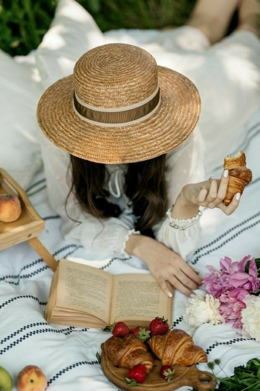 What to Pack: Books, fruit platter, croissants, straw hat, soft blanket