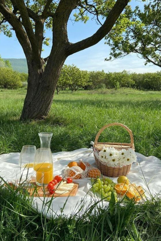 Simple yet beautiful, this minimal picnic layout is proof that less can be more. A white cotton blanket provides a clean canvas for wooden trays filled with grapes, oranges, and fresh citrus slices. A bottle of orange juice rests beside a woven basket of daisies, all shaded by a wide tree canopy.