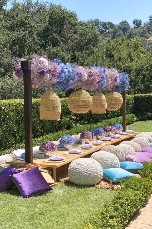 Tucked away in a garden, this table setup steals the show with hanging bunches of baby’s breath and neutral woven lanterns. Guests sit on plush knit poufs and velvet pillows while soaking in the lavender theme.