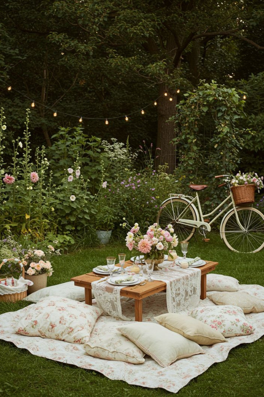 Set in a blooming backyard garden, this picnic is a vintage lover’s dream. A wooden table rests on floral pillows and a lace-trimmed cloth, surrounded by wildflowers, hanging string lights, and a classic cream bicycle with a flower basket. Every detail adds to the soft, layered charm, from the fresh floral centerpiece to the glassware glinting in golden-hour light.