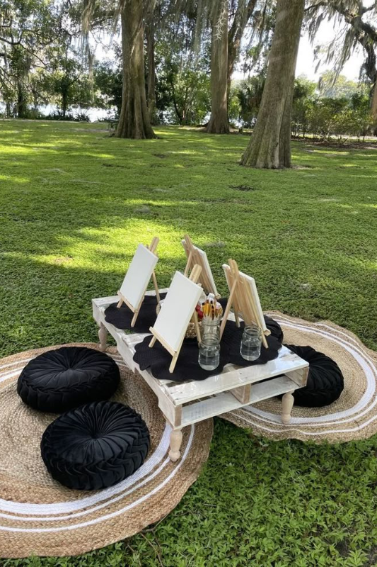A creative twist on picnic minimalism. With black tufted floor cushions, mini easels, and clean jute mats, this aesthetic setup is grounded yet expressive—perfect for focus, reflection, or capturing a modern vibe.