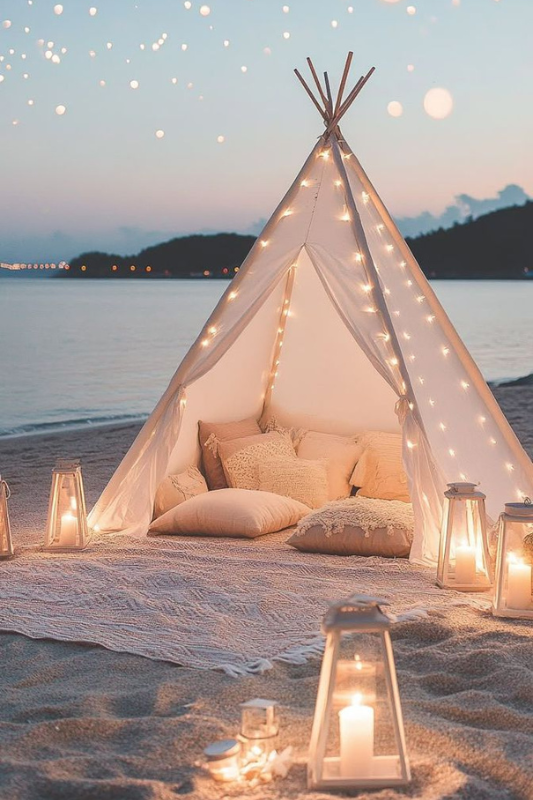Plus, beach teepee picnic is made for golden hour moments. The neutral palette and cozy textures keep the vibe relaxed, while the lighting turns the scene into something unforgettable. Perfect for anniversaries, proposals, or even just a special evening with a close friend.