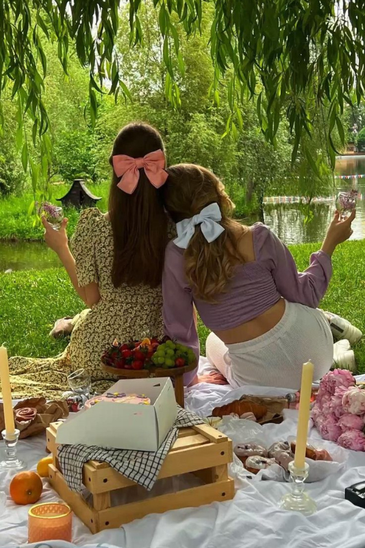 This picnic is all about friendship and thoughtfully styled moments. Two friends with matching bows enjoy a cozy spot by the water, surrounded by taper candles, floral cakes, fresh berries, and soft pastel touches.
