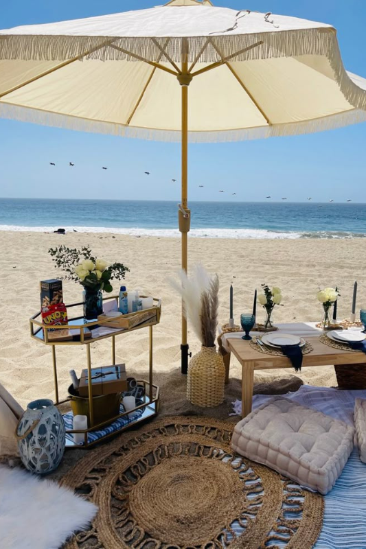 What to Pack: Beach picnic umbrella, boho picnic decor, woven mats, chilled drinks, florals