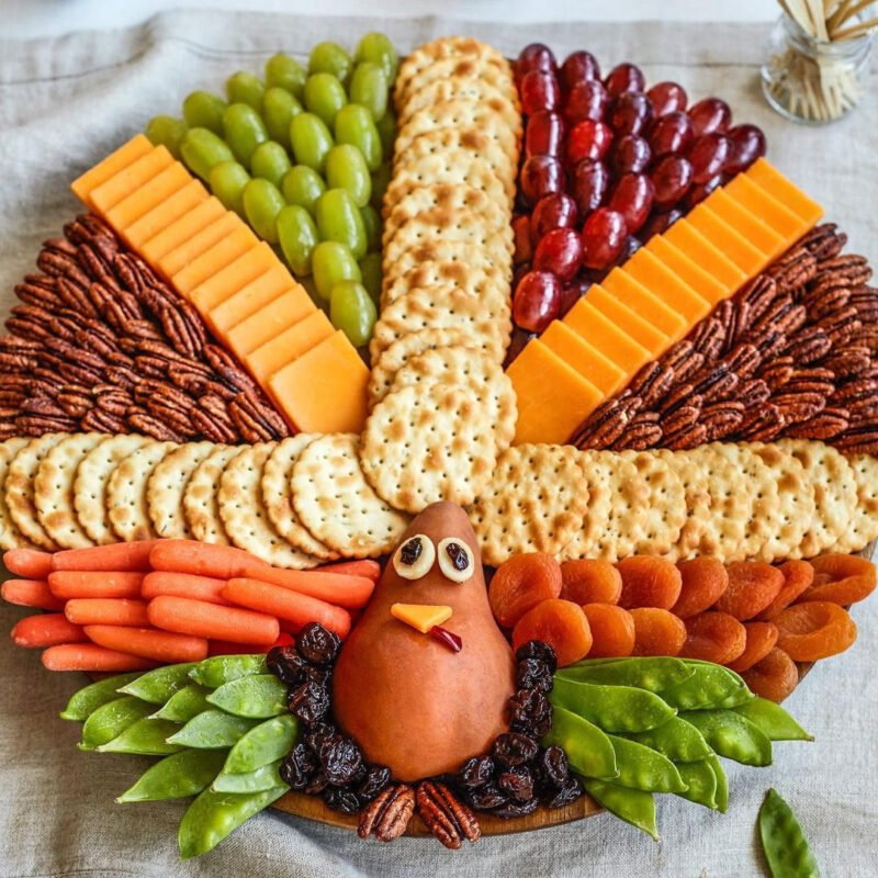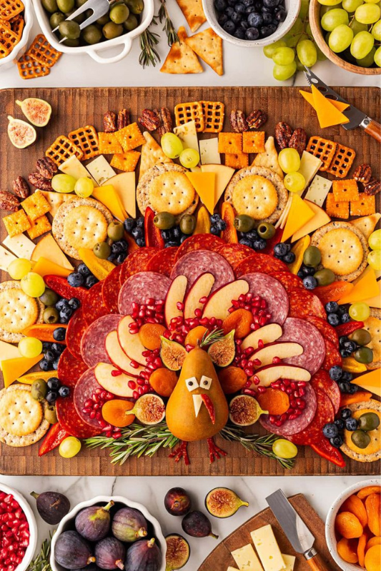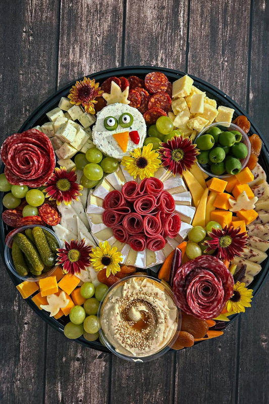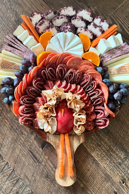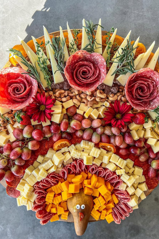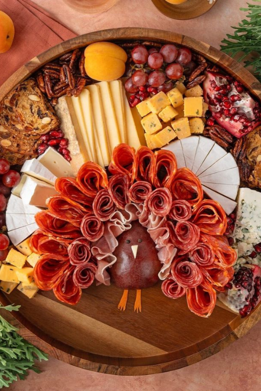 This showstopper uses color theory and texture layering like a pro. Rows of sliced cheese, cured meats, and carrots create a vivid turkey tail bursting with warmth. The “body” is a pear covered in sesame seeds, and a standout salami rose anchors the center, drawing the eye immediately. Add interest by alternating hard cheeses like cheddar with softer options like gouda or fontina, using crinkle cuts and knife scores for extra flair.