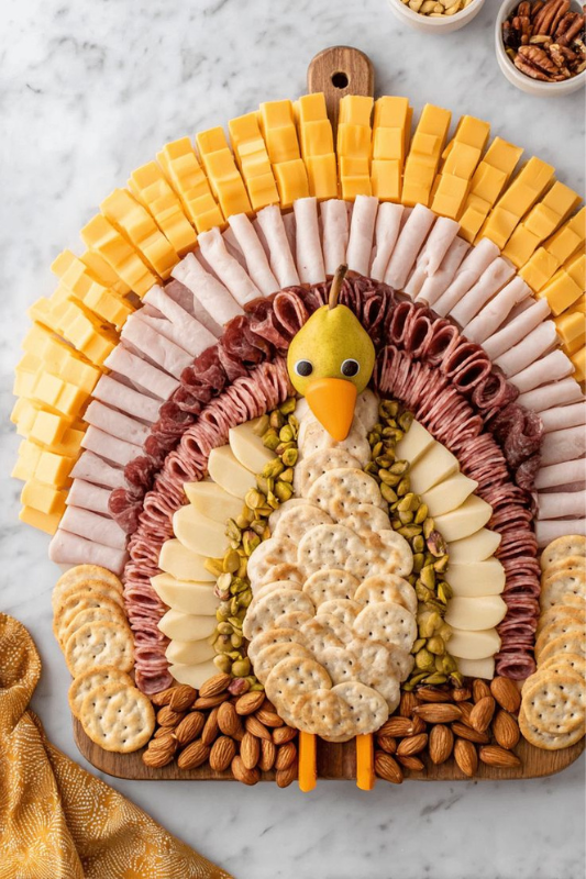 Consistent spacing makes or breaks a turkey-shaped board. Cut cheddar into equal cubes using a wire cutter and layer them in uniform rows alongside deli turkey and salami for a polished feathered fan. Use a ripe but firm pear as the turkey head, securing candy eyes and a carrot beak with a dot of cream cheese. Crackers form the body, while pistachios and almonds add both texture and balance. Always build from the outer rim inward to preserve shape as you work. For crisp apples or pears, dip slices in lemon water to avoid browning.