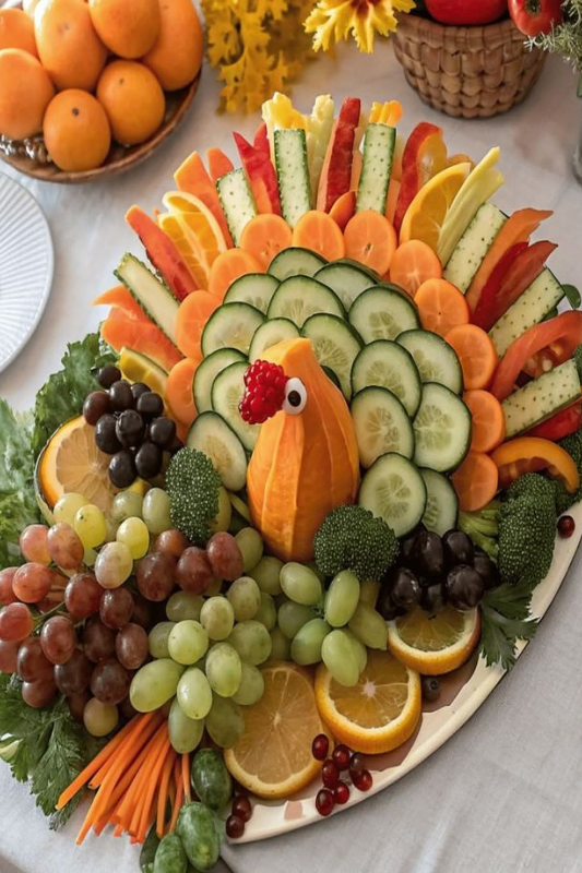 Health meets whimsy in this produce-forward platter. Sliced cucumbers, peppers, oranges, and broccoli shape a turkey bursting with fresh flavor. The body is sculpted from a carved orange, a fun touch kids will love. Pair this with hummus or ranch in mini pumpkins for a thematic dip station.