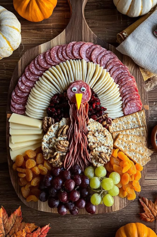 A round board provides instant balance. Spiral layers of salami and prosciutto form a fan shape, with a pear at the center acting as the turkey’s head. Use soft cheeses like brie or goat for shape contrast, then cluster grapes, pomegranate seeds, and cubed cheddar in color-blocked sections. Nestle rolled crackers or fruit crisps around the edge to add height and grip. Building in circular zones prevents crowding and keeps the focus anchored. This one blends elegance with rustic warmth, effortless and impressive.