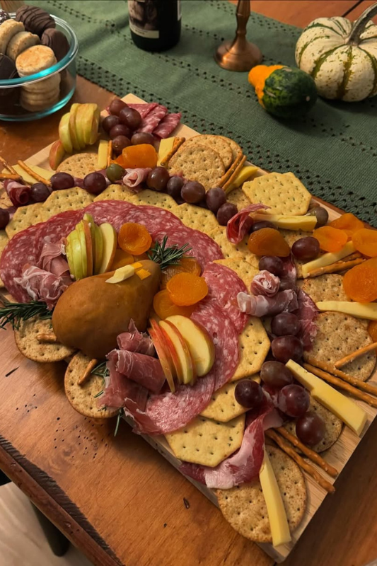 If you’re worried about overdecorating, balance is key. Arrange vibrant items (like green apples or dark grapes) to frame the lighter cheese tones. This draws the eye and gives depth to your spread. Want to personalize it further? Add a mini chalkboard sign that says “Grateful” or a small turkey figurine.