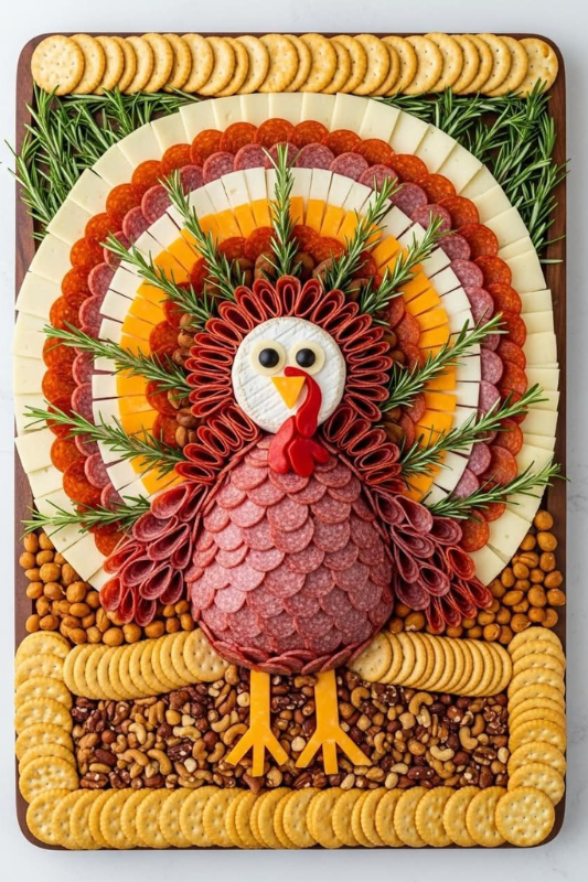Precision is the power move here. Salami slices are overlapped like shingles to build the body, while cheese and cured meat fans radiate outward in perfect symmetry. Use sliced mozzarella and cheddar for clean edges, then alternate colors for visual depth. Fresh rosemary sprigs give movement and keep lines crisp. Stick them into place between slices to lock layers down. Elevate the turkey’s head by forming it from whipped cheese and olive details—elegant, fun, and full of holiday flavor.