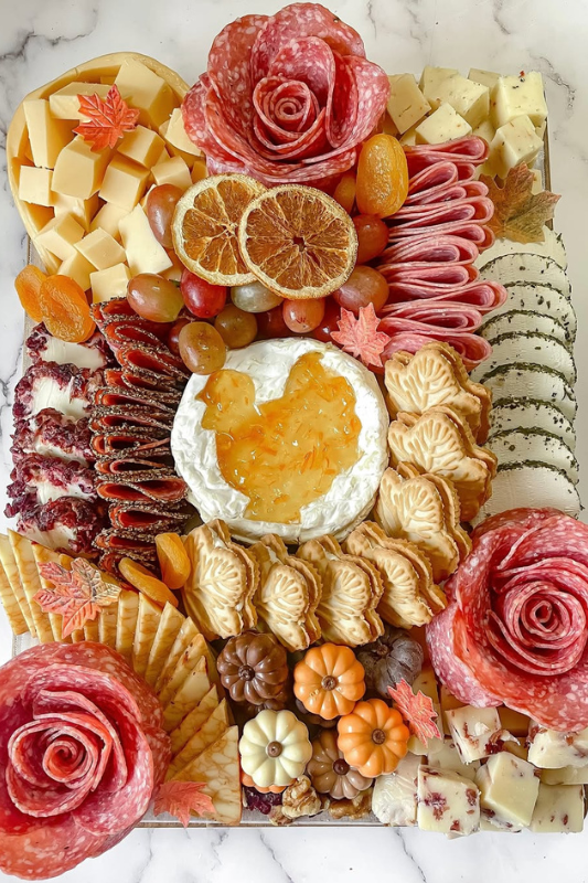 This board turns tradition sideways with a playful mix of sweet and savory. Pumpkin-shaped cookies, dried oranges, and leaf-cut salami surround a baked brie filled with orange marmalade. Stack meats into rosettes and use small chocolate pumpkins or figs as filler. For balance, pair dessert items with sharp cheeses like cranberry cheddar or aged gouda. Anchor creamy or sticky elements (like jam or brie) with drier items nearby to keep the board intact. A perfect fit for guests who graze through dessert before dinner.