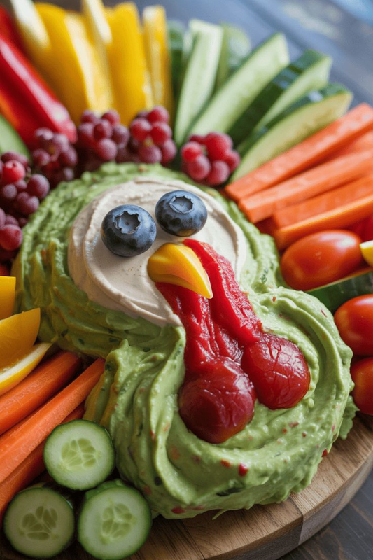 If you need a plant-forward centerpiece, this board does more than just tick the box. Guacamole forms the body and head, shaped with a spoon and detailed with cherry tomatoes, bell pepper strips, and blueberries for eyes. Build the feathers using vertical lines of sliced cucumber, carrot sticks, and colorful bell pepper. Add crunch with grape tomatoes and snap peas, and place thick dips like hummus or sour cream on top for extra structure. Serve chilled and build just before guests arrive to maintain freshness.