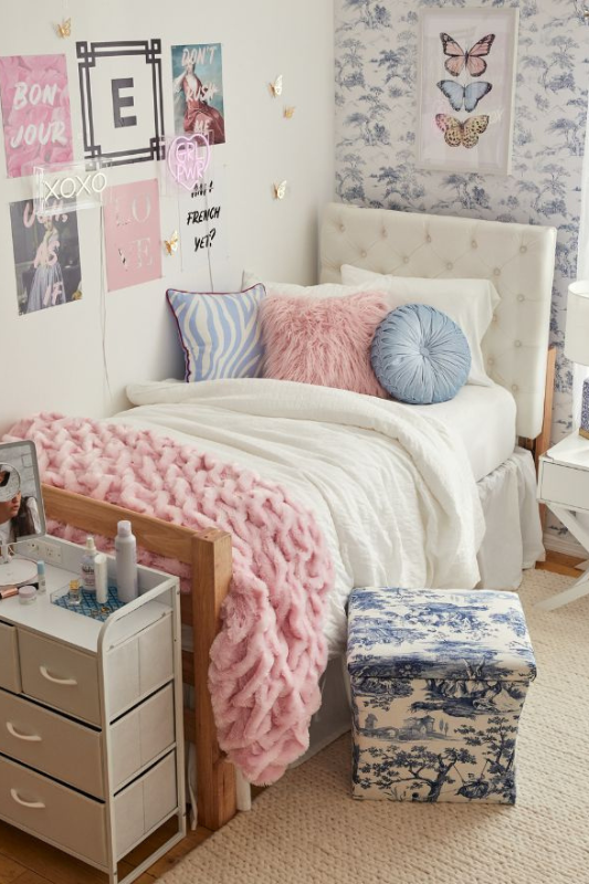 Say bonjour to this perfectly curated dorm with major girlboss energy! The tufted headboard and fluffy blush pink throw give it a glam upgrade, while pastel wall art and butterfly decals add dreamy details.