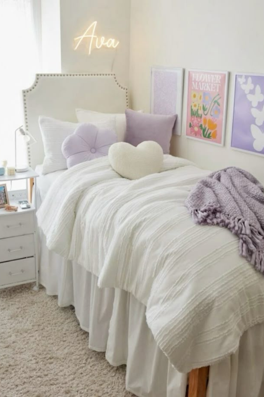 This sweet and serene dorm setup is giving clean girl meets cottagecore. A crisp white bedding set creates a bright foundation, while pops of lavender in the throw blanket, pillows, and wall art bring in soft, calming color. The heart and flower pillows add a playful touch, and a custom neon name sign gives it a chic, personal twist. Layered textures and framed prints complete the cozy, polished look.