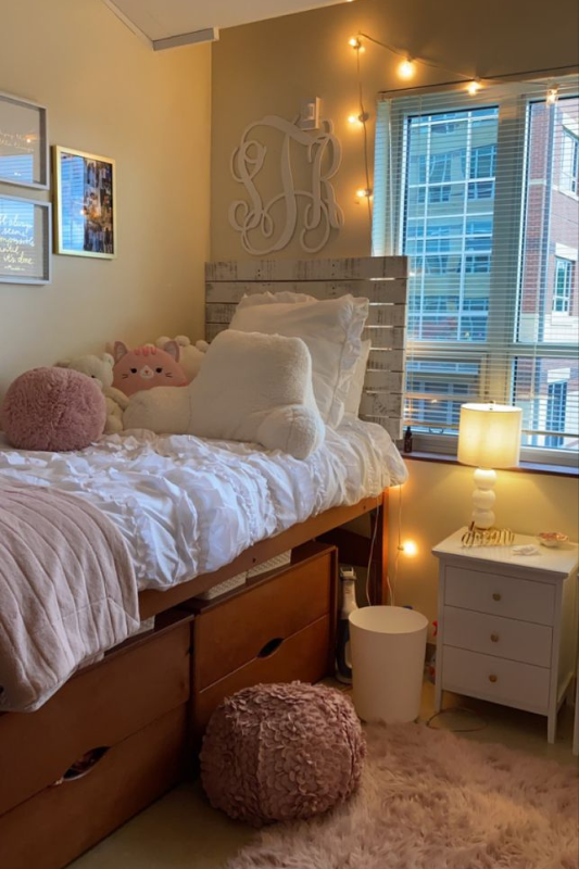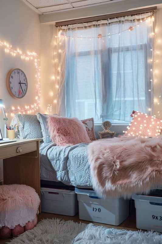This dreamy dorm room nails the cozy-glam aesthetic with layers of soft textures, shimmering lights, and stylish storage. The blush pink faux fur pillows and throw add luxe comfort, while the twinkling string lights create a magical ambiance around the bed and window.