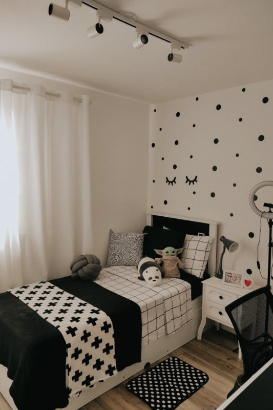 2. Modern Monochrome Dorm With Playful Polka Vibes