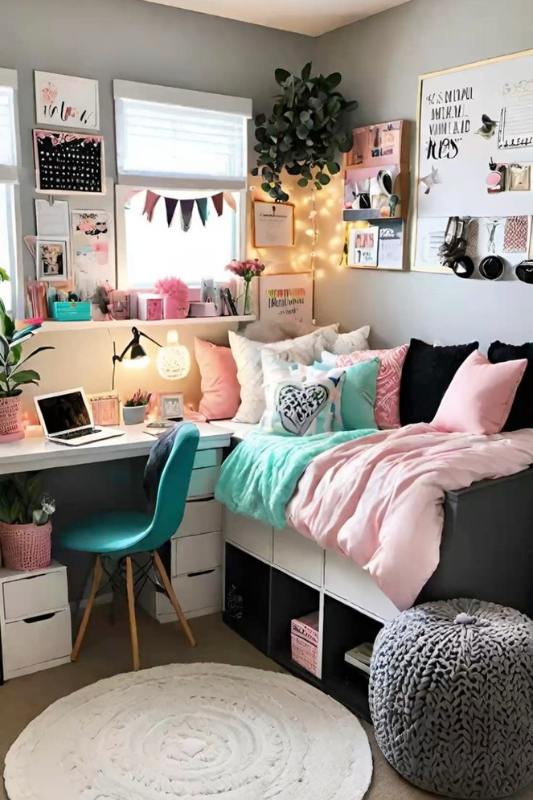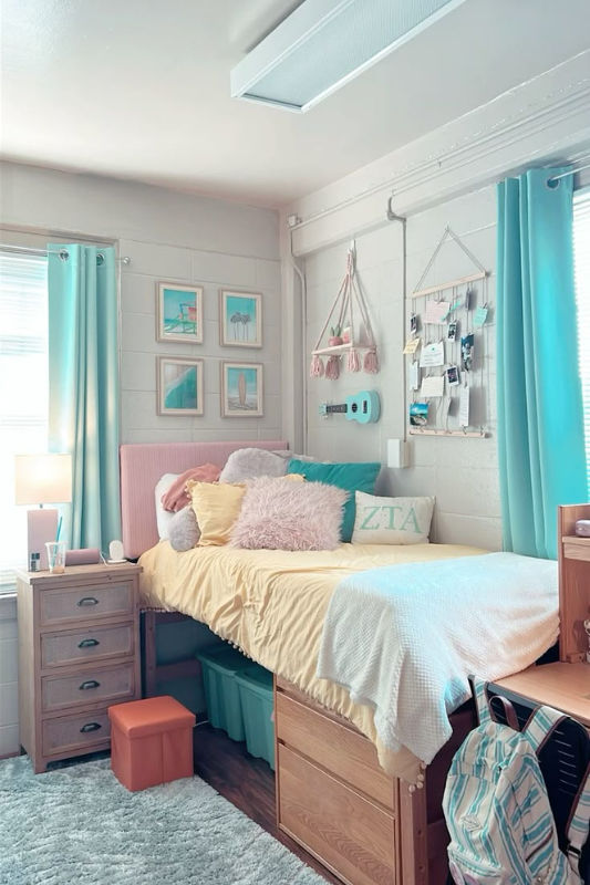Bright, cheerful, and totally functional—this dorm setup is every college student’s dream come true! The soft pastel palette of blush pink, aqua, and mint green brings instant calm, while layered pillows and throws make the bed feel plush and inviting.