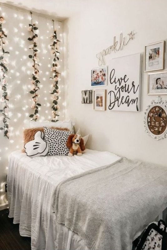 Bring major personality to your dorm with this cozy, Disney-inspired setup! Twinkling curtain lights paired with faux floral garlands create a magical backdrop perfect for winding down or snapping aesthetic photos. A plush white bedding set, neutral throw blanket, and fun accent pillows add layers of texture and charm.