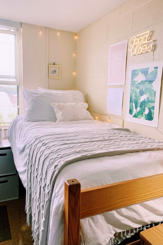 This light, airy college dorm room idea proves that simplicity doesn’t mean boring. The all-white bedding and textured throw blanket create a calm, clean base, while pastel wall art and a “Good Vibes” neon sign inject subtle personality.