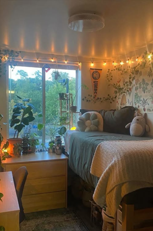 String lights, leafy vines, and potted plants transform this dorm room into a calming, garden-like escape. The window becomes a natural focal point, surrounded by layered greenery that catches soft daylight and creates a peaceful view from the desk.