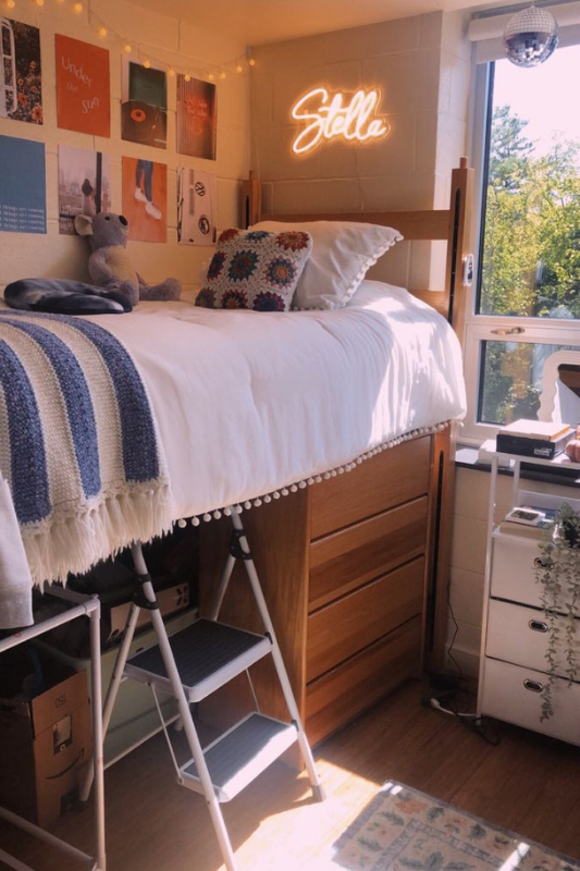 Raised bed storage keeps everything organized with cubes and drawers, while a small stool and side cart offer extra surface space, perfect for beauty routines or late-night study snacks. If you’re into light, breezy college dorm aesthetics, this layout is equal parts calming and functional.