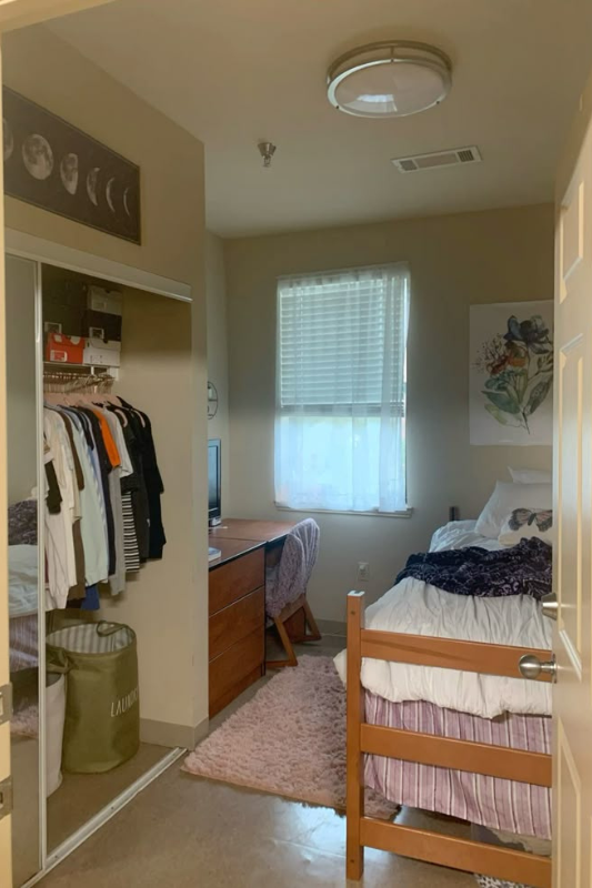 Sliding mirrored closet doors visually double the room while offering extra function. Stick to one or two cozy dorm room essentials like a fuzzy throw and minimal wall art to keep things feeling peaceful and personalized. A perfect example of college dorm room ideas cozy without the clutter.