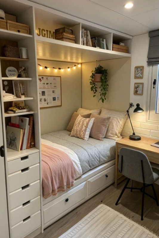 Built-in shelving takes your college dorm room decor to the next level, making every inch count. The bed is tucked neatly into a cozy alcove, surrounded by storage cubbies, drawers, and open shelving that show off both function and personality.