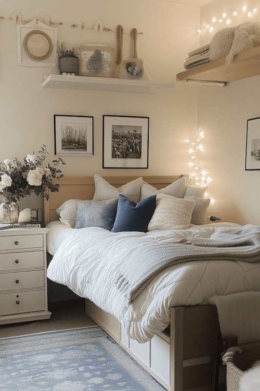 Neutral tones like ivory, oatmeal, and soft slate blue create a relaxed and grounded atmosphere perfect for a focused and stress-free college dorm room. The matching bedding and throw pillows provide symmetry, while framed black-and-white photos bring a refined edge without overpowering the space. Twinkle lights and a fresh floral arrangement add just the right amount of softness and charm.