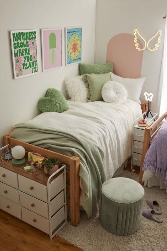 Mix pastel green accents with minimal blush tones, add wall art that makes you smile, and layer pillows for a cozy and aesthetic college dorm room idea that’s both uplifting and on-trend.