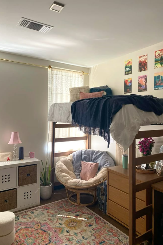 This stylish college dorm room idea is a cozy, culture-rich setup that balances creativity with comfort. By lofting the bed, the room instantly gains valuable space making room for a plush Papasan chair that acts as the ultimate reading or relaxation nook. The woven frame and blush accent pillow add a soft, textural contrast to the deep navy blanket and layered white bedding.