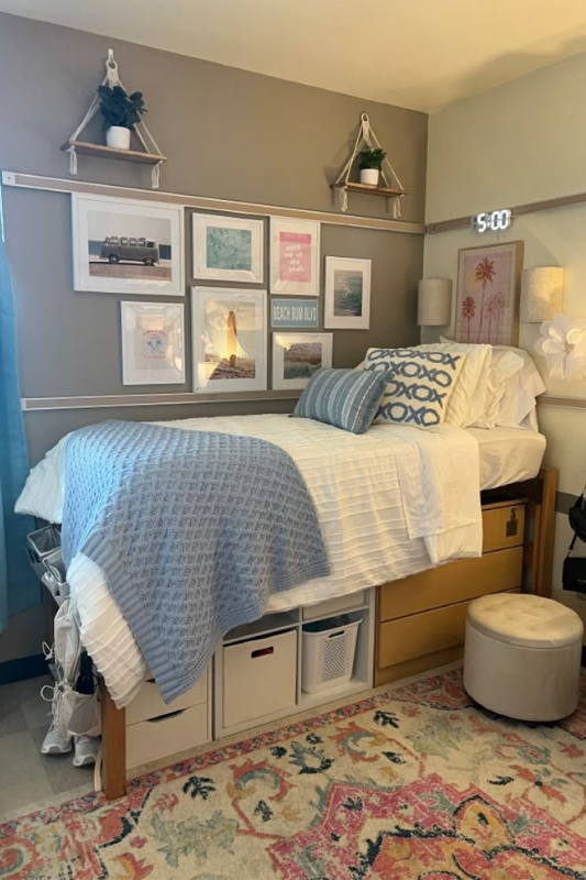 13. Coastal Vibes Dorm With Gallery Wall & Functional Storage