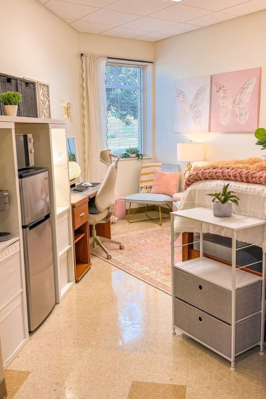 This bright and welcoming college dorm room feels more like a boutique suite than a student space. The soft blush and ivory color palette creates a calming atmosphere, while butterfly canvas prints and gold finishes bring a touch of elegance. The layout makes smart use of space by placing the bed and desk along one wall, leaving room for a cozy lounge chair and ottoman near the window.