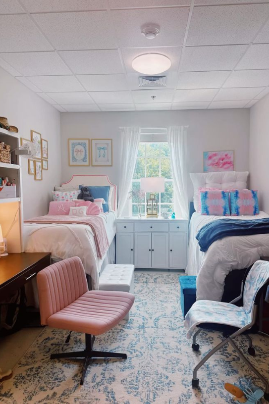 This shared college dorm room blends personality and balance with a mirror-style layout and coordinated color palettes. One side features pink and pastel tones while the other leans into blues and tie-dye, creating a fun contrast that still feels cohesive. The center storage cabinet doubles as a window bench, giving both roommates space to decorate or relax.