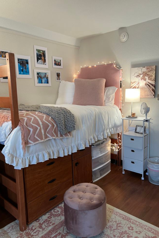 This college dorm room is the definition of comfort meets charm. A ruffled bedspread, blush upholstered headboard, and layered throws in soft pink and gray tones make the bed the clear focal point. Twinkle lights outline the corner for a warm glow, and personal photos on the wall add just the right amount of homey energy.