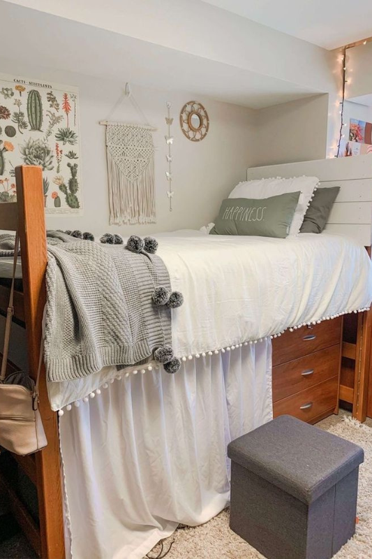 Raised beds are a go-to in many dorms, but this setup takes it a step further by using a full-length curtain to hide underbed storage. Paired with a textured gray knit throw, soft pom details, and layered white bedding, the sleeping area feels restful and elevated.