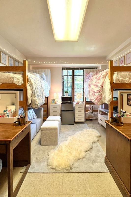 This perfectly mirrored college dorm room is both stylish and functional a top-tier example of a cozy and coordinated setup. Lofted beds open up the center floor space, allowing for a plush lounge area complete with a white shag rug, boucle ottomans, and a comfy loveseat. Dual desks on each side offer individual work zones, while string lights and pastel bedding add that perfect college dorm aesthetic. Every inch is maximized without compromising style.