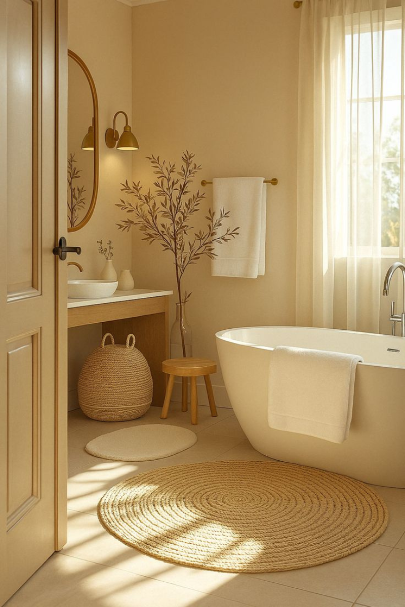 Mount a short ladder shelf to the wall for a creative take on towel storage. The rungs can hold hand towels or bath towels, while the top rung can double as a display spot for greenery or small accents. It’s a nice mix of form and function—especially in cozy, rustic bathrooms.