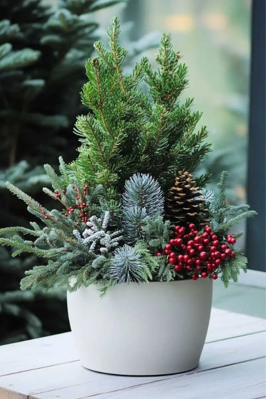 White and beige planters offer a fresh, minimalist base for snowy greens, flocked pinecones, and oversized white ornaments. This clean combination captures the beauty of winter while keeping things calm and modern. Perfect for homes with Nordic, farmhouse, or neutral holiday palettes, these Christmas planter designs create impact without over-decorating.