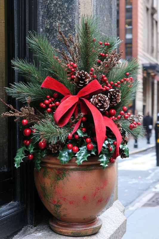 An aged terracotta urn becomes a timeless holiday focal point when packed with pine sprigs, holly branches, and frosted cones. A wide red velvet bow tied around the center adds elegance and height. This is one of the most effortless ways to style outdoor Christmas planters that feel rich, layered, and classic without needing inflatables or heavy lighting.