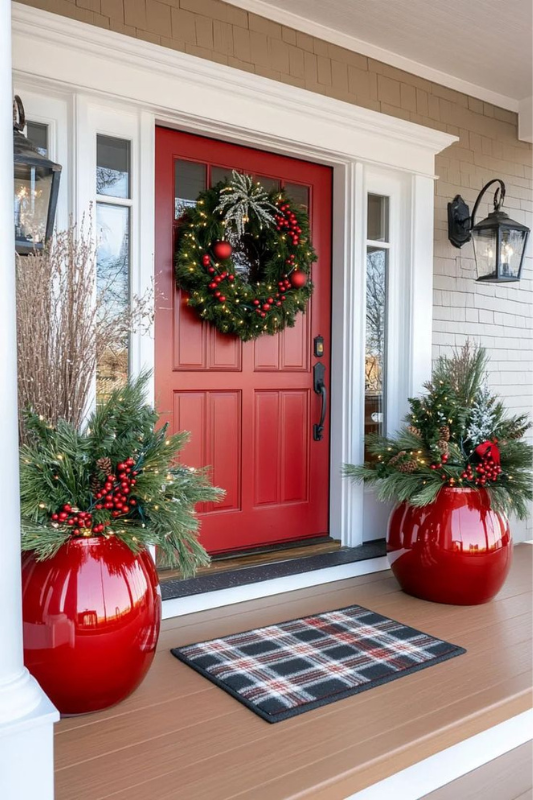 Oversized red planters instantly add festive curb appeal when filled with a mix of fresh cedar, pine branches, and red berry stems. Pinecones layered near the base create a rustic texture while a strand of fairy lights adds soft evening glow. This design makes a bold front porch statement and works beautifully with both traditional and modern Christmas planter ideas.