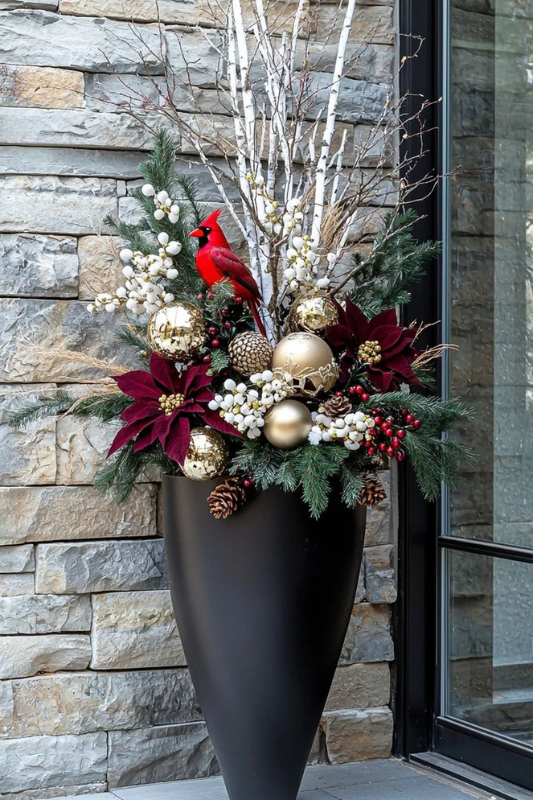 A sleek black urn is filled with birch sticks, red and white berries, pine branches, and deep red poinsettias. The cardinal perched on the greens adds a bold natural touch. This is a showstopping example of large Christmas planter ideas that suit tall entrances or stone-front homes.