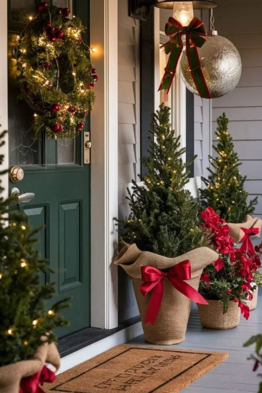 Burlap fabric tied with red ribbons wraps around potted mini evergreens, adding instant charm to a classic porch. These trees glow softly with string lights and line the walkway with traditional symmetry, making them ideal for easy Christmas planter ideas with high impact.